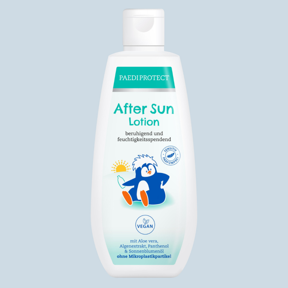 PAEDIPROTECT After Sun Lotion pflegt die empfindliche Kinder- und Erwachsenenhaut nach dem Tag im Freien mit einem hautberuhigenden und feuchtigkeitsspendenden Komplex aus Aloe Vera und Panthenol. Der enthaltene Algenextrakt aus Laminaria Ochroleuca mindert UV-bedingte Hautirritationen und beruhigt die sonnenstrapazierte Haut. Darüber hinaus stärkt Sonnenblumenöl die Hautbarriere und sorgt für wohltuende Geschmeidigkeit. Die leichte, nicht klebende Textur zieht schnell ein und ist besonders sanft zur Haut.