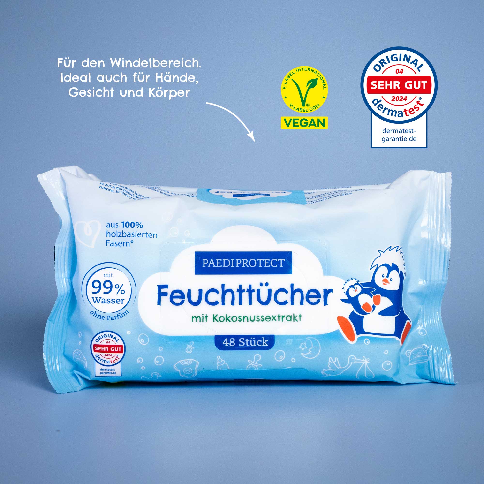Die PAEDIPROTECT Feuchttücher bestehen aus 100 % holzbasierten Fasern mit 99 % Wasser und natürlichem Kokosnussextrakt angereichert. Sie sind dermatologisch getestet, parfumfrei und ideal für die sanfte Reinigung empfindlicher Haut