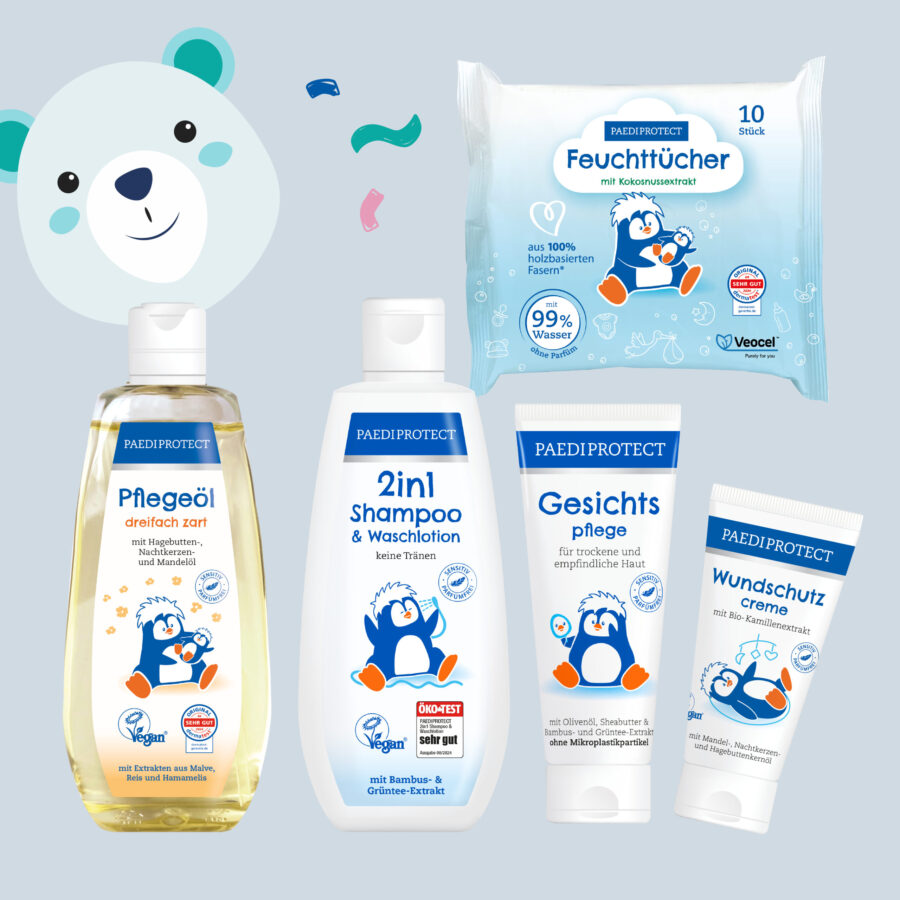 - Die PAEDIPROTECT Feuchttücher (1 x 10): Bieten eine besonders schonende Reinigung und Pflege, ideal für empfindliche Haut. Sie bestehen zu 99 % aus reinem Wasser und sind mit natürlichem Kokosnussextrakt angereichert. Dank der dermatologisch getesteten Formel eignen sie sich hervorragend für die tägliche Anwendung – selbst bei sensibler Haut.