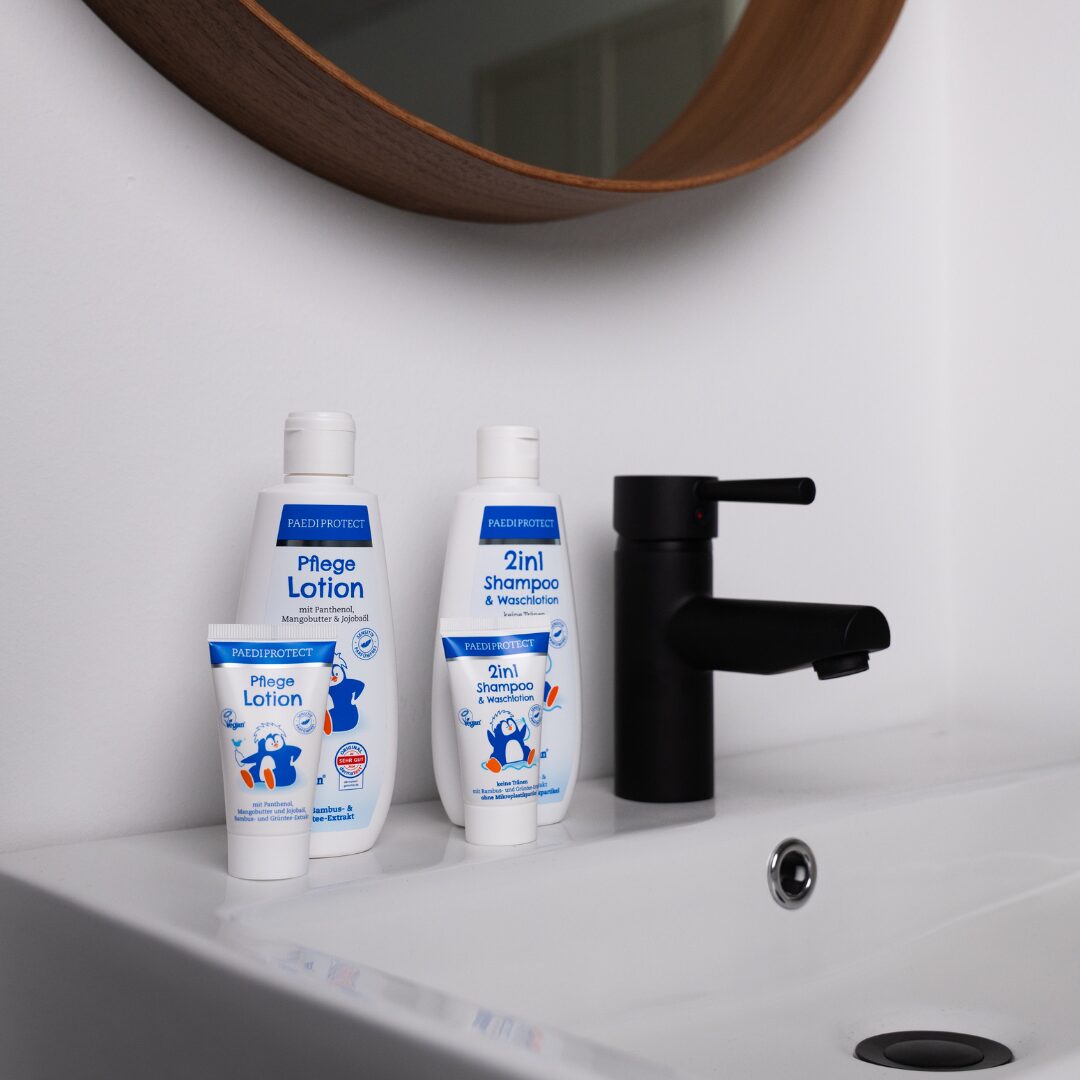 Das 2in1 Shampoo & Waschlotion schäumt zart auf und reinigt sanft Haut & Haar – ohne Tränen.