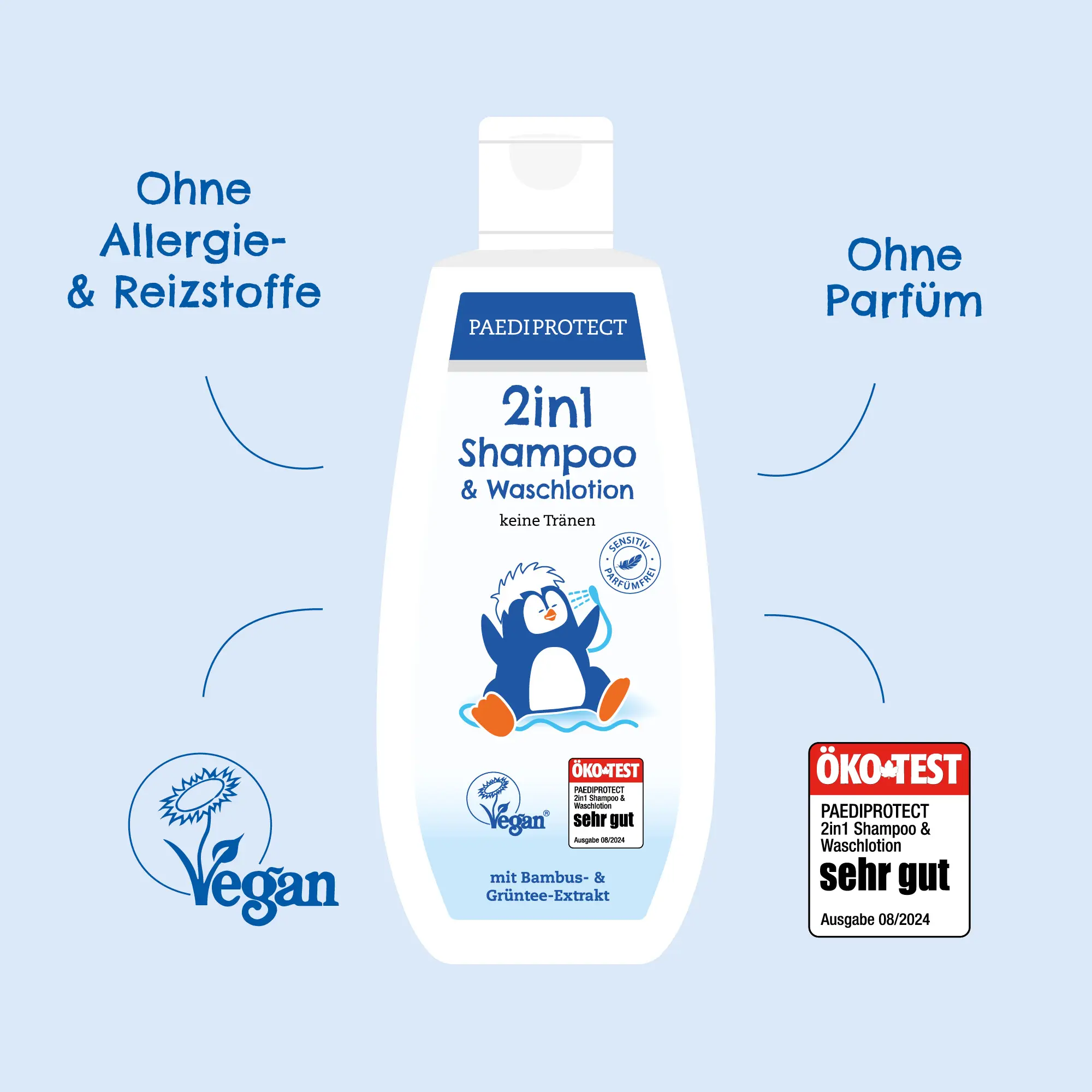 PAEDIPROTECT 2in1 Shampoo & Waschlotion reinigt Haut und Haar besonders schonend durch sehr milde Waschsubstanzen pflanzlichen Ursprungs. Die sanfte Formulierung schäumt zart auf und hilft der Haut dabei, ihre natürliche Schutzfunktion zu bewahren. Die enthaltenen Extrakte aus Bambus und grünem Tee sind bekannt für ihre hautberuhigende, kräftigende Wirkung und schützen die Haut vor Austrocknung und äußeren Einflüssen. Ideal auch für Erwachsene mit sensibler, trockener oder zu Neurodermitis neigender Haut als Duschgel zu verwenden.