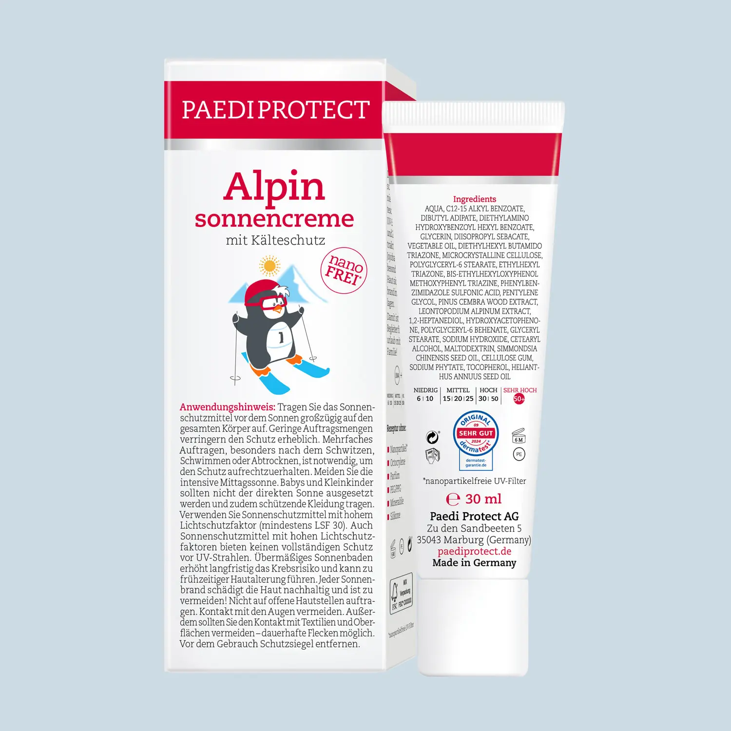 PAEDIPROTECT Alpinsonnencreme ist der ideale Begleiter bei wintersportlichen Aktivitäten. Der kombinierte Schutz vor Sonne und Kälte ist für sensible und empfindliche Haut in alpinen Gebirgslagen entwickelt worden. Bio-Edelweiß- & Zirbelkiefernholzextrakt und Jojobaöl versorgen die Haut mit Vitaminen, pflegen und schützen. Die Hautverträglichkeit ist auch bei hochsensibler Haut dermatologisch bestätigt. Die PAEDIPROTECT Alpinsonnencreme ist daher für die ganze Familie geeignet, auch für empfindliche (Baby-)Haut.