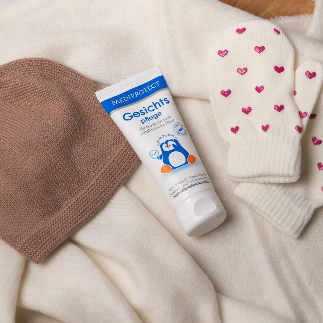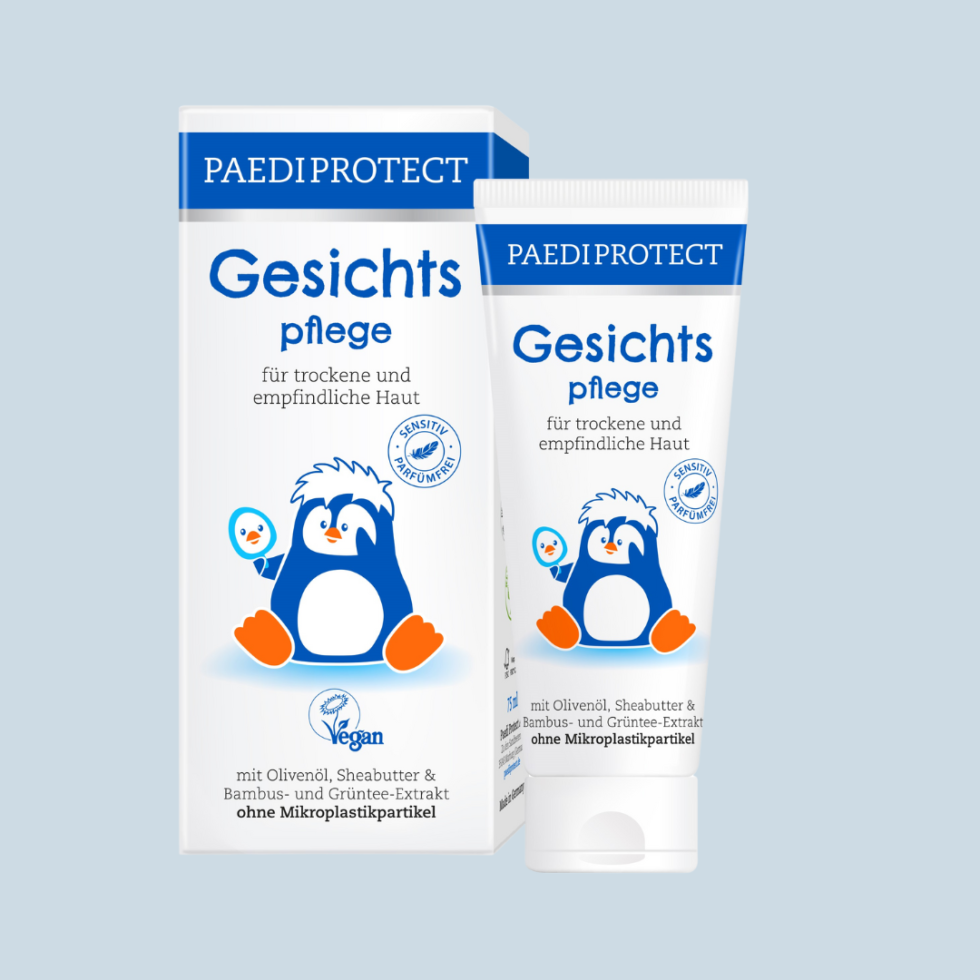 PAEDIPROTECT Gesichtspflege ist eine reichhaltige Creme, die optimal für sensible oder gereizte Haut im Gesicht geeignet ist. Kaltgepresstes Olivenöl und Sheabutter verwöhnen und pflegen die Haut intensiv, speichern Feuchtigkeit langanhaltend und schützt sie vor Austrocknung. Die Creme versorgt die zarte Gesichtshaut durch ihre Wirkformel mit Pflegestoffen, wirkt hautberuhigend bei Reizungen und Rötungen und hilft dabei der Haut langfristig in ihrem natürlichen Gleichgewicht zu bleiben. Ideal auch für Erwachsene mit sensibler oder zu Neurodermitis neigender Haut.