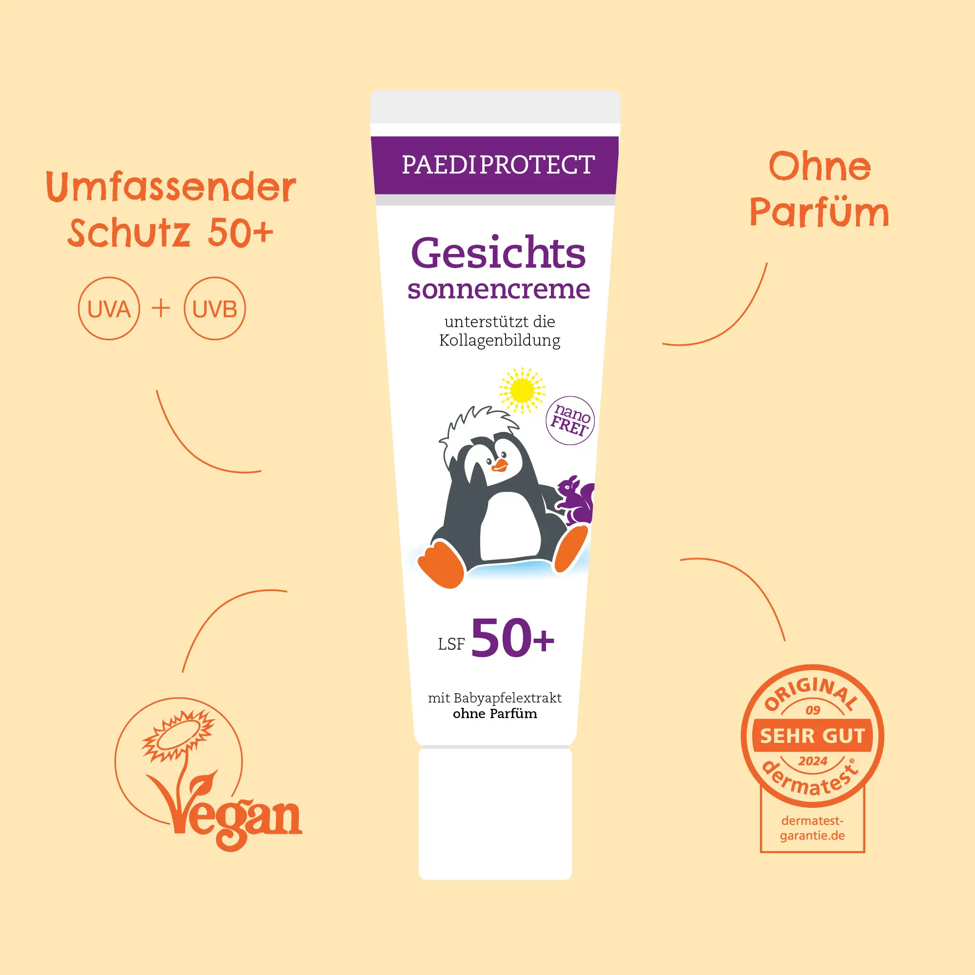 PAEDIPROTECT Gesichtssonnencreme ist unser Allrounder für den Alltag, egal zu welcher Jahreszeit. Während unser Körper zumindest teilweise durch Kleidung geschützt ist, setzen wir die Haut im Gesicht täglich der Sonne aus. Sehr hoher LSF 50+ schützt vor UVA/UVB-Strahlung und sonnenbedingten Hautschäden. Die leichte Textur klebt nicht, zieht schnell ein und hinterlässt keinen weißen Film auf der Haut. Babyapfelextrakt pflegt empfindliche Haut und unsere innovative Formulierung fördert sogar die Bildung von Kollagen.