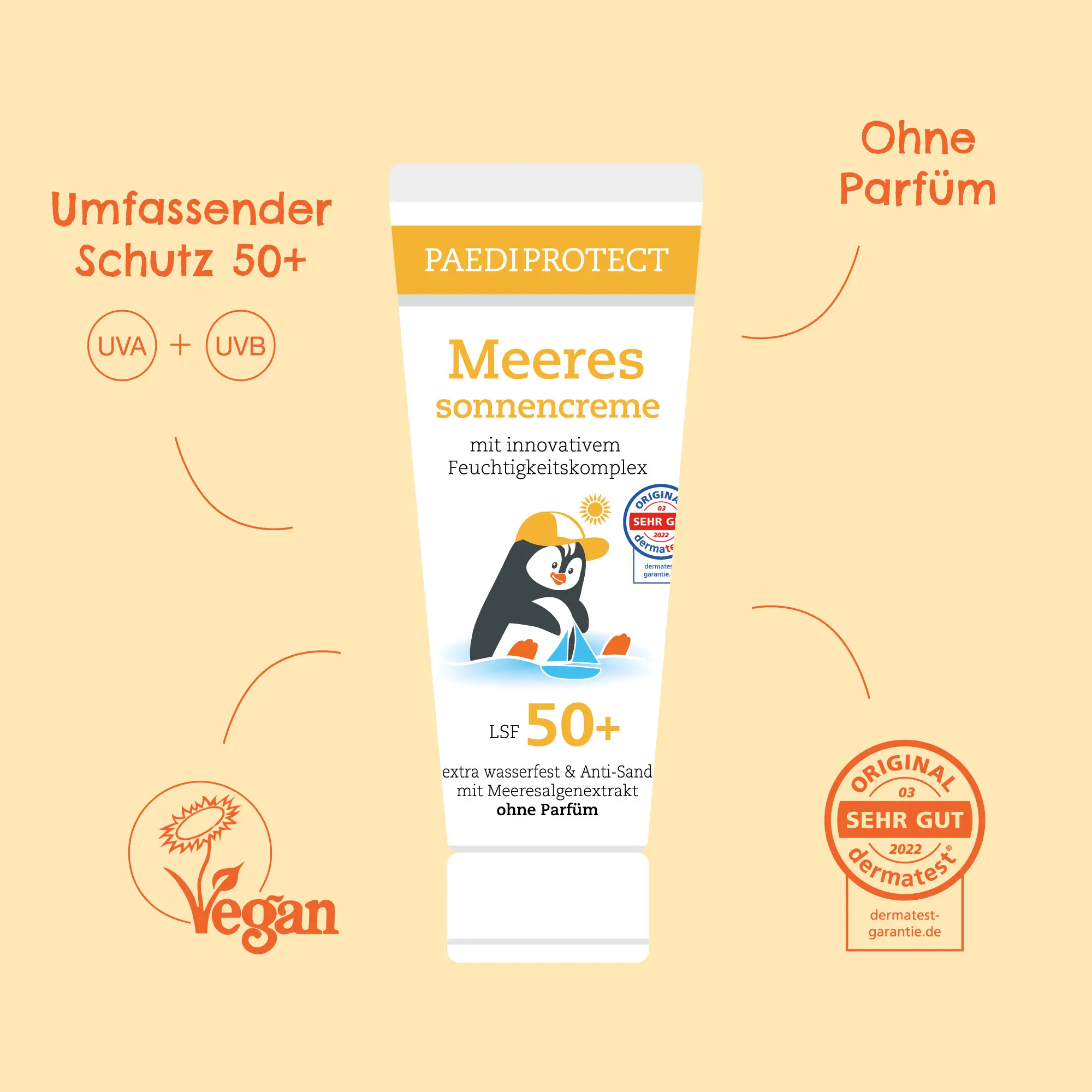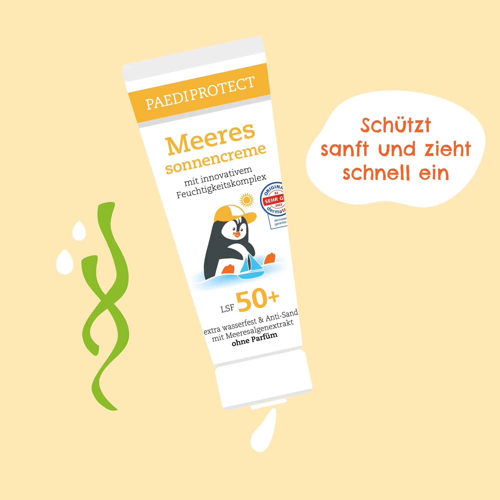 PAEDIPROTECT Meeressonnencreme kombiniert sehr hohen UV-Schutz mit Wasserfestigkeit und Anti-Sand-Formel – perfekt für Strand, Meer & Planschbecken.