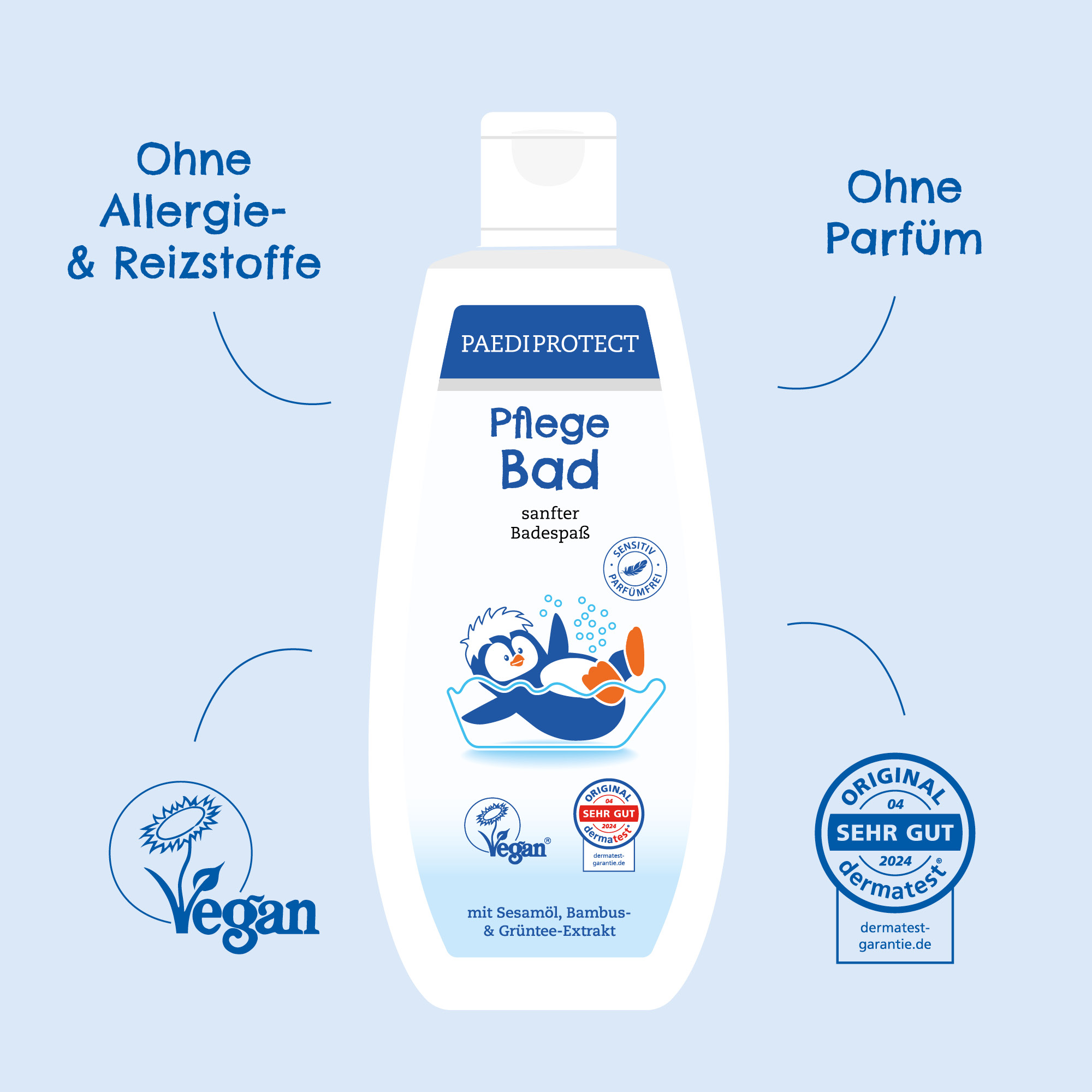 PAEDIPROTECT Pflegebad ist ein besonders hautschonender und zart aufschäumender Badezusatz. Milde Waschsubstanzen auf pflanzlicher Basis reinigen und pflegen die Haut ohne sie auszutrocknen. Wertvolles Sesamöl macht die Haut geschmeidig, glättet sie und hält sie in einem guten Zustand. Die enthaltenen Extrakte aus Bambus und grünem Tee haben eine hautberuhigende, kräftigende Wirkung. Damit bietet das Pflegebad einen sanften Badespaß für Babys und Kinder, aber auch für Erwachsene mit sensibler, trockener oder zu Irritationen neigender Haut.