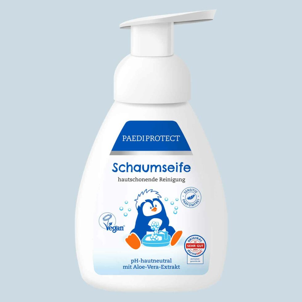 Die PAEDIPROTECT Schaumseife reinigt die Hände besonders schonend und hygienisch, ohne den Säureschutzmantel der Haut anzugreifen. Die ph-neutrale Seife enthält pflanzliche Waschsubstanzen und pflegt die Haut mit Aloe Vera und Glycerin. Die beiden Inhaltsstoffe sind dafür bekannt Feuchtigkeit besonders gut in der Haut zu binden. Die sanfte und parfümfreie Formulierung schäumt zart auf und hilft der Haut dabei ihre natürliche Schutzfunktion zu bewahren. Ideal für Kinder und Erwachsene mit sensibler, trockener oder zu Neurodermitis neigender Haut.