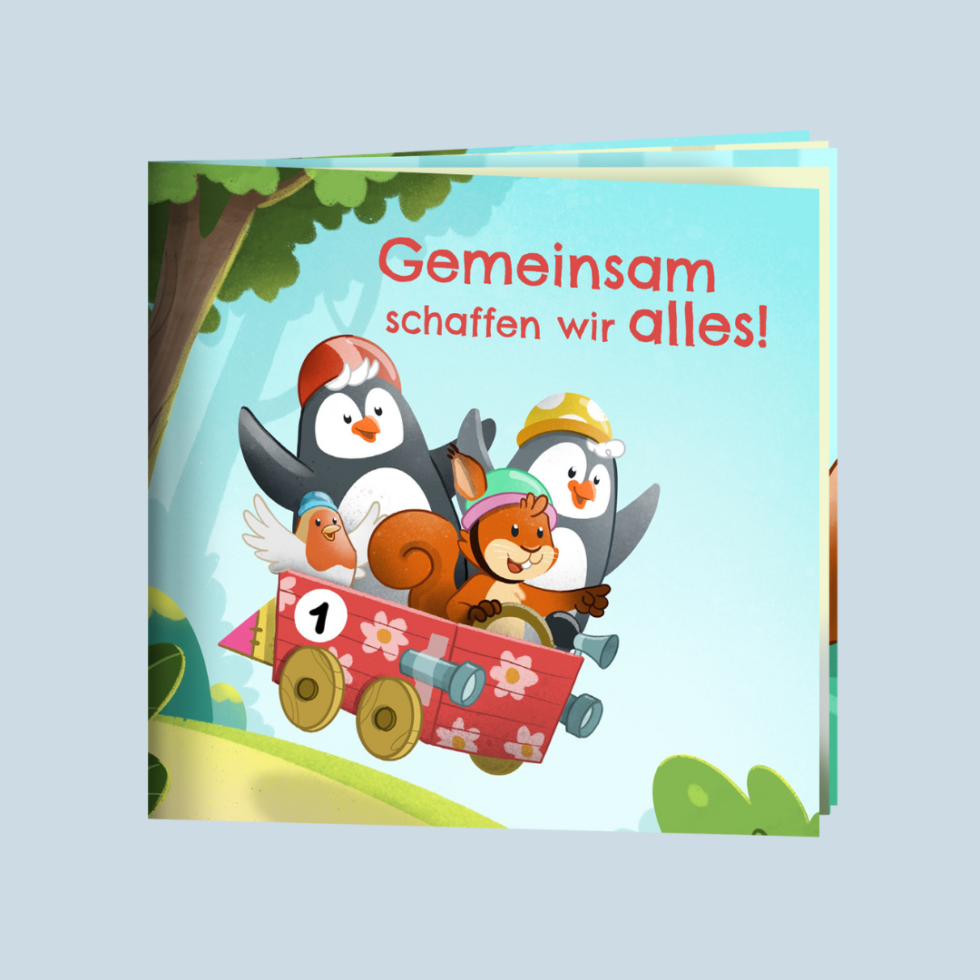 In „Gemeinsam schaffen wir alles” erwacht unser Pinguin Pauli zusammen mit seinen Freunden zum Leben. Auf 12 farbenfroh illustrierten Seiten erzählen wir sein erstes kleines Abenteuer.