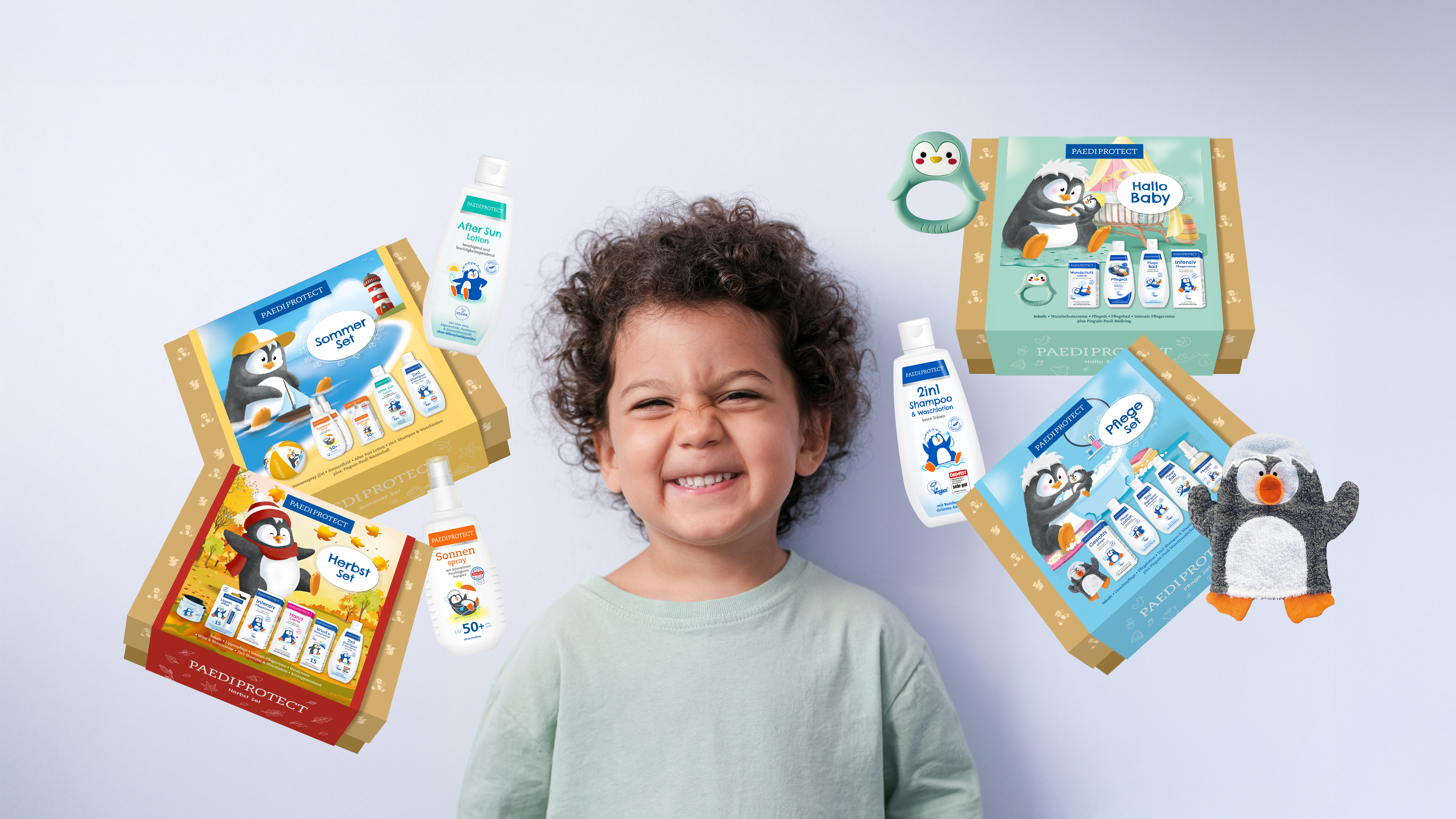 PAEDIPROTECT Sets vereinen mehrere Pflegeprodukte, die sich in ihrer Wirkung sinnvoll ergänzen und gemeinsam eine abgestimmte Pflegeroutine ermöglichen. Dabei steht immer die empfindliche Baby- und Kinderhaut im Fokus: Alle Produkte sind parfümfrei, vegan und dermatologisch getestet.